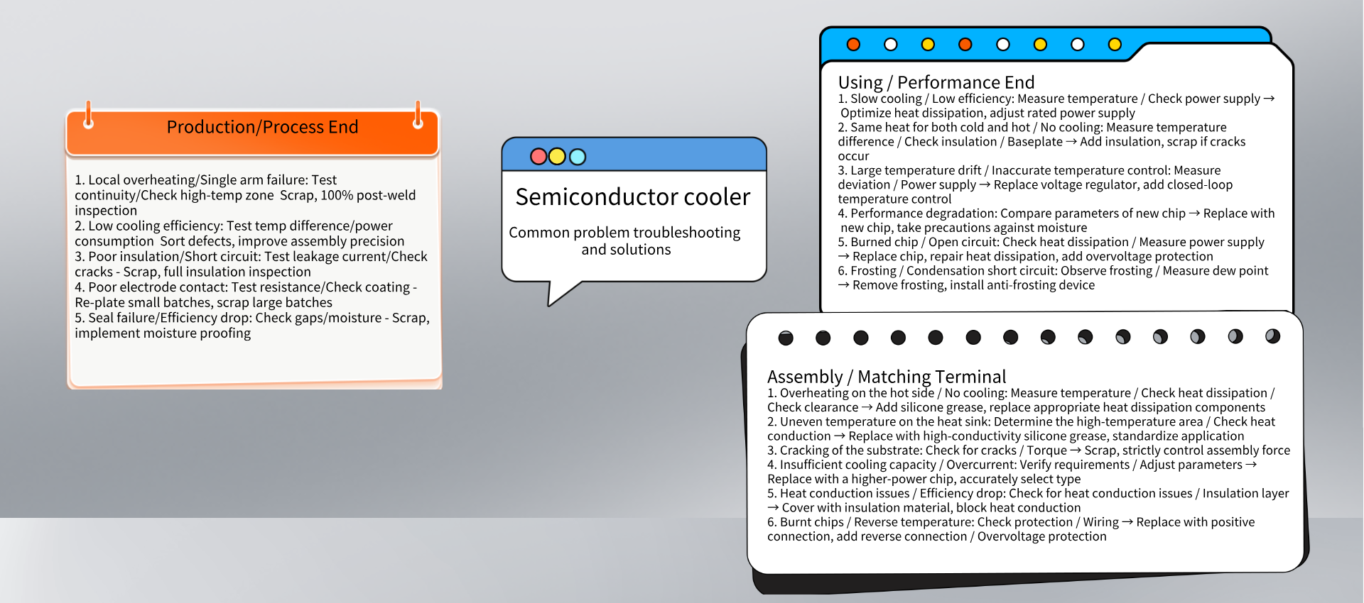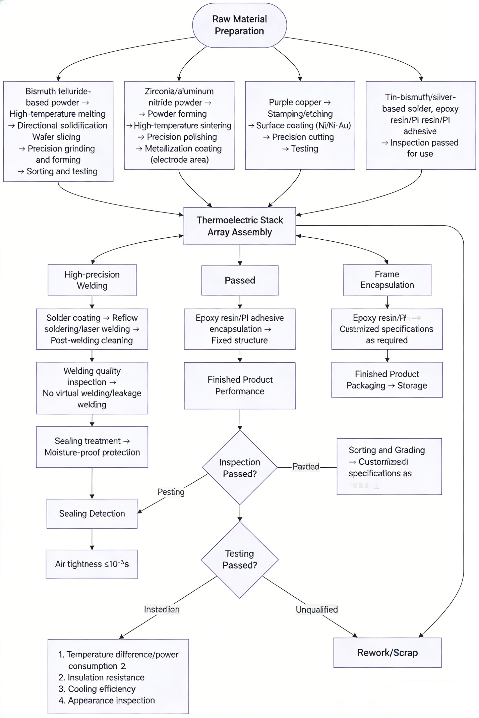 1. Raw material preparation: Bismuth telluride is the main material, with antimony/seelenium as the dopant. Combined with the specified substrate and copper conductor, it is processed through vacuum melting and directional solidification to produce N/P type ingots; the substrate and the flow guide component are clean and free of impurities, and the flow guide component is protected against oxidation. 2. Steel ingot processing: N/P type steel ingots undergo annealing to relieve internal stress, are precisely cut into standard grains, and unqualified products are screened out. 3. Substrate metallization: The ceramic substrate is equipped with copper/nickel/gold electrodes. Low-melting-point solder paste is applied through sputtering/electroplating to form multi-layer electrodes. High-precision printing is employed, ensuring no missed or false printing of the pads. 4. PN crystal grain arrangement: The automated equipment arranges N/P type crystals alternately on the substrate with solder pads, forming a thermoelectric stack array with precise positioning without any offset. 5. Reflow Soldering: The upper and lower substrates are welded to form a crystal array. The temperature is controlled in two stages for curing to prevent damage; after soldering, ultrasonic cleaning is used to remove residues, and hot air drying is performed. 6. Terminal Outlets: Ultrasonic/laser welding of wires to positive/negative connection terminals to ensure good conductivity and no false soldering. 7. Packaging protection: Apply heat-resistant glue to the edges and connection points to enhance protection; Mark the model, specifications, and production date with inkjet printing. 8. Finished product inspection: Test the cooling capacity, temperature difference, and insulation resistance. After undergoing cold and hot cycle/vibration tests, qualified products will be packaged with anti-static and moisture-proof measures and then stored in the warehouse