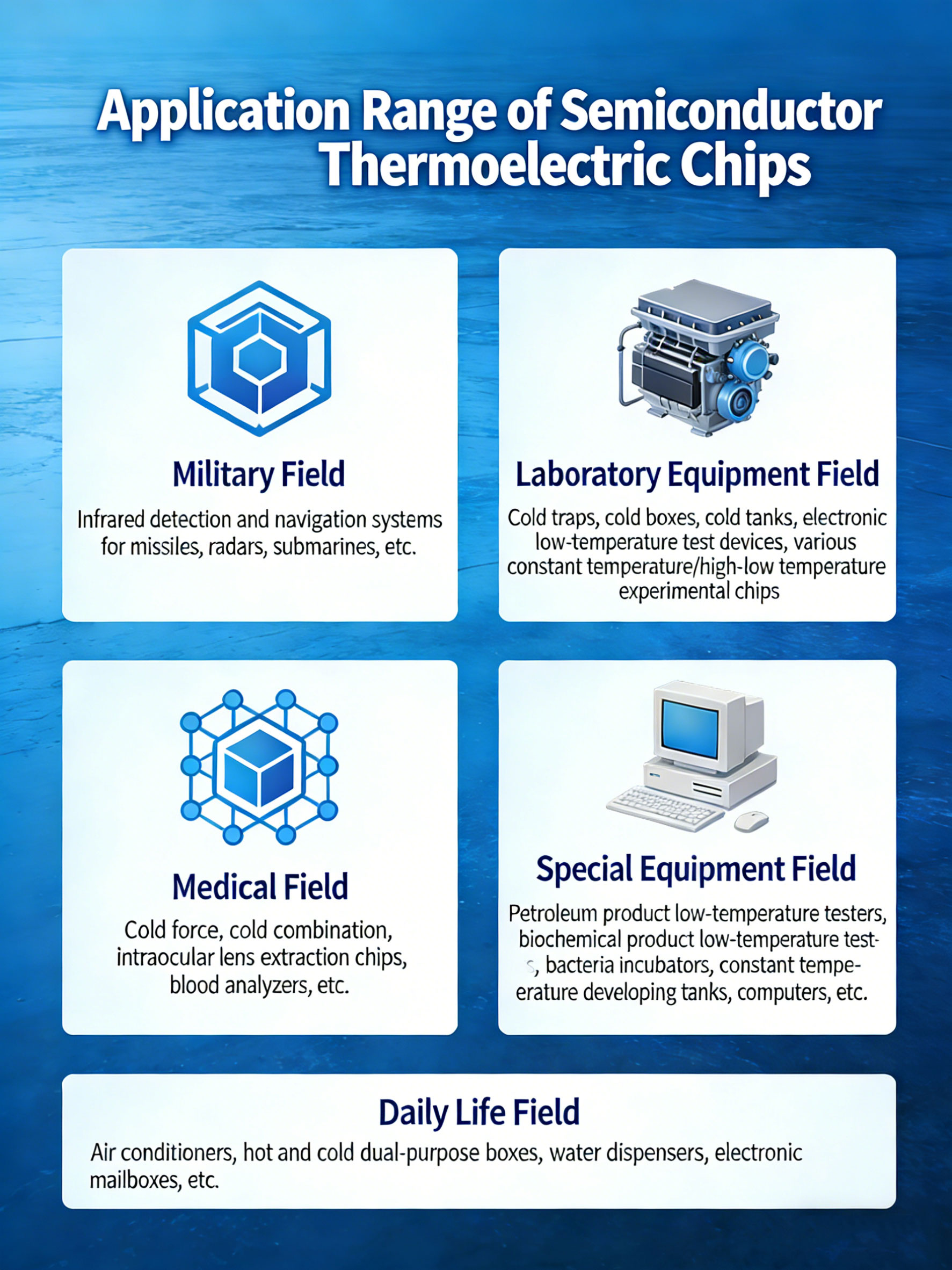 3. Laboratory equipment: cold traps, cold boxes, cold tanks, electronic low-temperature testing devices, various constant temperature and high-low temperature experimental instrument chips.