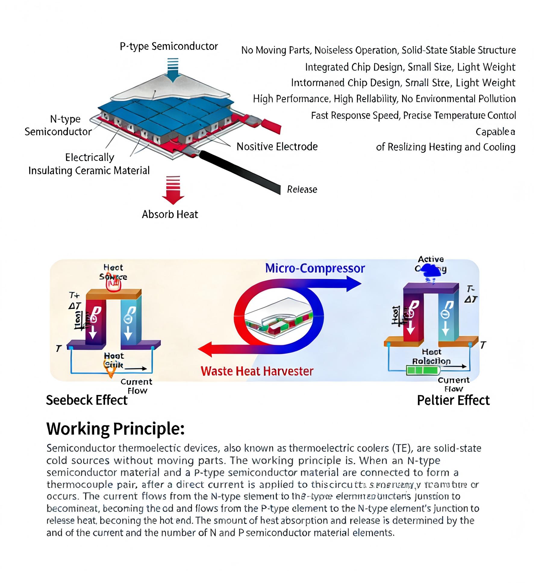 Among them, N-type materials contain excess free electrons, while P-type materials have electron vacancies (i.e., "holes"). The electrons and holes act as carriers for heat transfer. As they move, they drive the heat through the thermoelectric element.