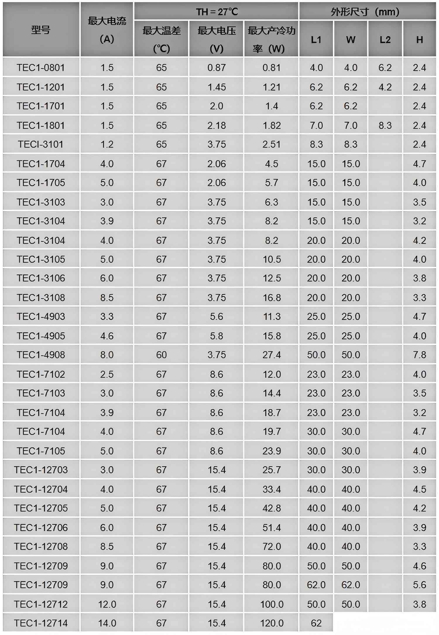 Parameters of semiconductor cooling sheet
