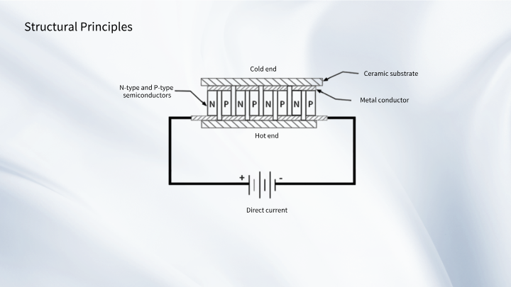 When the current direction is reversed, the functions of the cold and hot ends are swapped, enabling bidirectional heating/cooling control.
